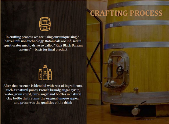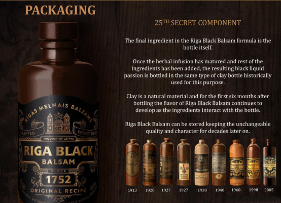 里加黑香脂酒配方的最后一种成分即是所选用的酒瓶本身。 植物浸液酿好后,加入剩余的成分,将浓烈甘醇的黑色液体装入瓶中,正如这种粘土瓶自古以来都用来装酒一样。 粘土是一种天然材料,在装入里加黑药酒的前六个月内由于与瓶体接触反应,其口味仍在持续发酵中。 里加黑药酒可以被数十年的存放,保持着品质和特性的如一。