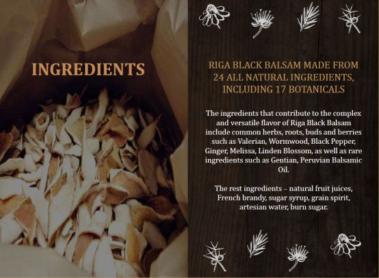 里加黑香脂酒由源自植物的全天然成分制成。 不同的成分赋予里加黑香脂酒丰富的复合风味,不添加任何色素和合成香料。